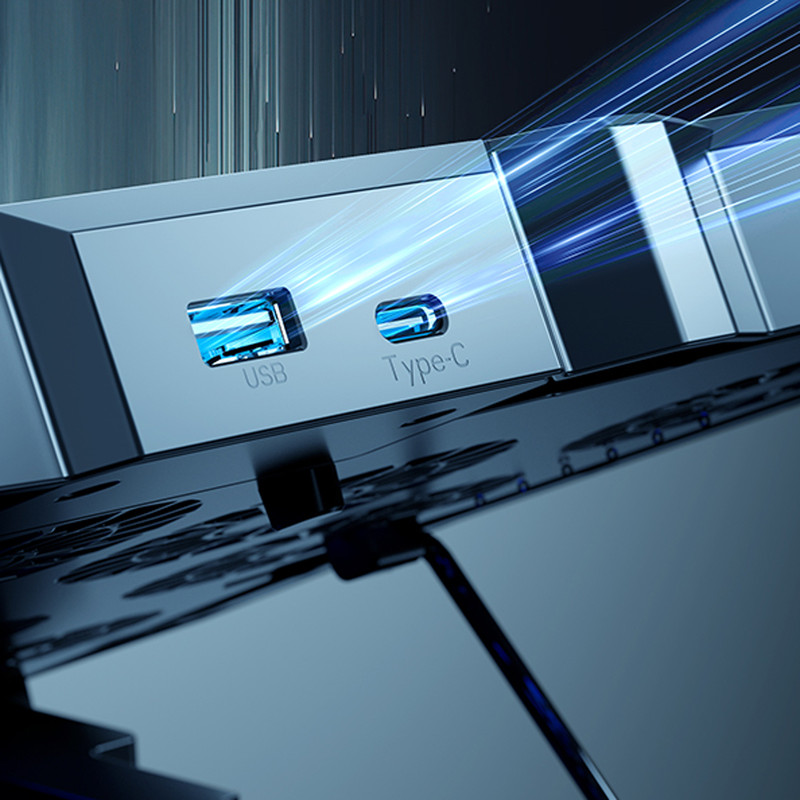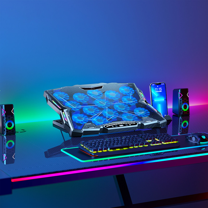 قابلیت‌های استند و پایه خنک‌کننده : کلید روشن/خاموش , قابلیت تنظیم ارتفاع , خروجی USB , نورپردازی LED تک رنگ