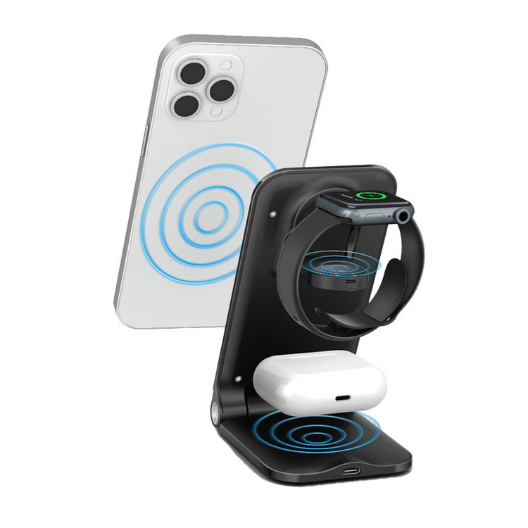 سایر توضیحات: فابلیت شارژ 3 دستگاه تلفن همراه و ساعت هوشمند و ایربادز به طور همزمان , قابلیت جمع شوندگی , ولتاژ خروجی برای تلفن همراه : 5W , 7.5W , 10W , 15W , ساعت هوشمند : 2W , ایربادز : 3W