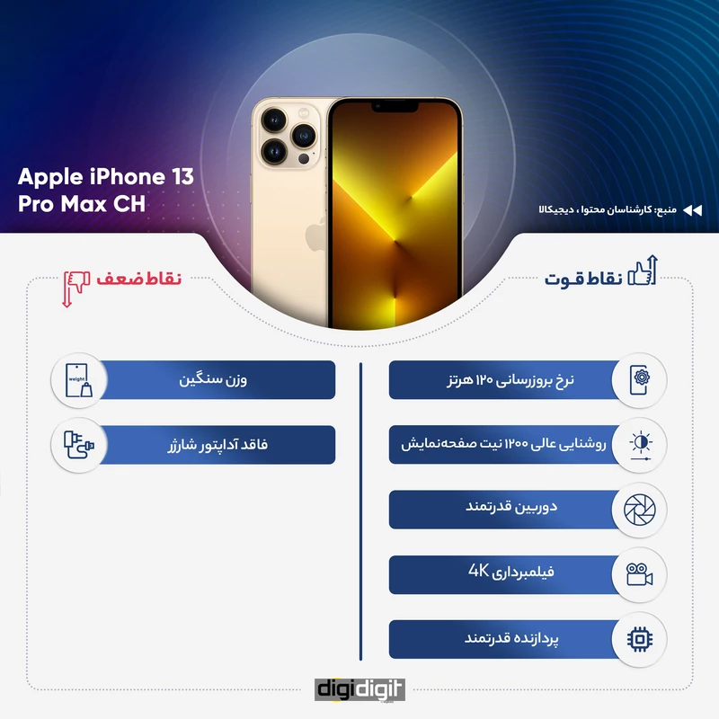 متاسفانه این کالا در حال حاضر موجود نیست. میتوانید از طریق لیست بالای صفحه، از محصولات مشابه این کالا دیدن نمایید.بدون هیچ تعریف اضافی باید بگوییم که iPhone 13 Pro Max یکی از قدرتمندترین گوشیهای هوشمند پرچمدار موجود در بازار است که توانست رکوردهای جدیدی را به نام خودش ثبت کند. این گوشی به صفحهنمایش 6.7 اینچ و رزولوشن 2778x1284 با توانایی نمایش 458 پیکسل در هر اینچ، نرخ بروزرسانی 120 هرتز، حداکثر روشنایی 1200 نیت (nits)، تمام هرآنچه از یک صفحهنمایش باکیفیت توقع دارید را در اختیارتان میگذارد. در قسمت پشتی سه سنسور دوربین به همراه یک سنسور LIDAR با همان طراحی آیفون 12 پرو مکس قرار گرفتهاند. یک سنسور دوربین اصلی با رزولوشن 12 مگاپیکسلی با گشودگی دریچه دیافراگم f/1.5، سنسور دوربین 12 مگاپیکسلی از نوع فوق عریض (Ultra Wide) و سنسور 12 مگاپیکسلی از نوع تله فوتو، دوربین سهگانه آیفون 13 پرو مکس را تشکیل می دهند. البته سنسور TOF 3D LiDAR scanner هم برای این گوشی در نظر گرفته شده است که عملکردی مشابه ولی بهتر از سنسور سنجش عمق را دارد و قابلیتهای جذابی را در اختیارتان قرار میدهد. پردازنده A15 بایونیک هم اینبار قدرتمند تر از همیشه متشکل از شش هسته این پرچمدار قدرتمند را همراهی میکند. حض.ر چنین پردازندهای سبب شاهد تا iPhone 13 Pro Max به راحتی هرچه تمامتر از پس اجرای سنگینترین بازیهای روز دنیا بربیاید. باتری قدرتمند با میزان ظرفیت 4352 میلیآمپرساعت این گوشی هم توانایی ارائه طول عمر مفید بهتری به نسبت بسیاری از پرچمداران شرکتهای دیگر به ازای هر بار شارژ صد درصدی دارد. در مجموع اگر به دنبال یک پرچمدار همه جیز تمام و البته با اصالت هستید، قطعا iPhone 13 Pro Max یکی از بهترین انتخابهای ممکن برای شما است. گوشیهای نات اکتیو با قرار گرفتن سیمکارتهای داخلی اکتیو میشوند و برخلاف مدل اکتیو پلمپ کالا باز نشده است. گوشیهای اکتیو برند اپل هم به این شکل هستند که به دلیل محدودیتهای برخی از محصولات اپل برای کشور ایران، در کشورهای همسایه بهصورت رسمی با یک بار قرار گرفتن سیمکارت، اکتیو شده و پلمپ میشوند و باید بدانید که این پروسه هیچ مشکلی در راستای گارانتی کالا بههمراه ندارد. پارتنامبرهای اروپا و ژاپن و امارات تک سیمکارت هستند و پارتنامبرهای مربوط به امارات هم از فیس تایم پشتیبانی نمیکنند. پارتنامبر JA (ژاپن) هم حتی در حالت سایلنت صدای شاتر عکس قطع نمیشود.