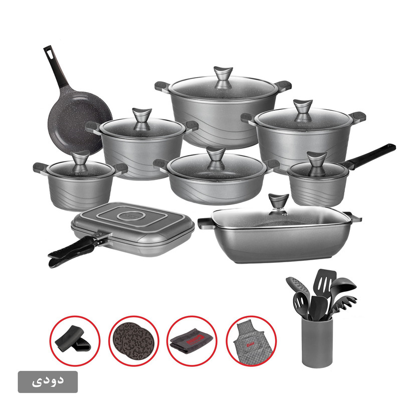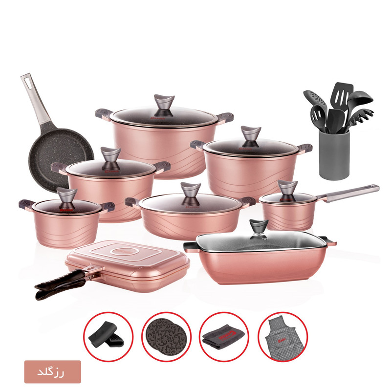 اقلام سرویس : قابلمه , تابه , دستگیره , پیشبند , زیرقابلمه‌ای , سرویس کفگیر و ملاقه
