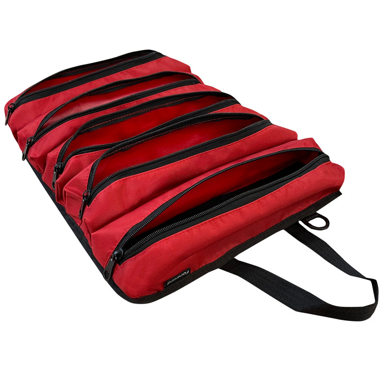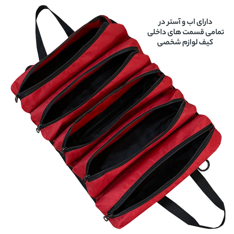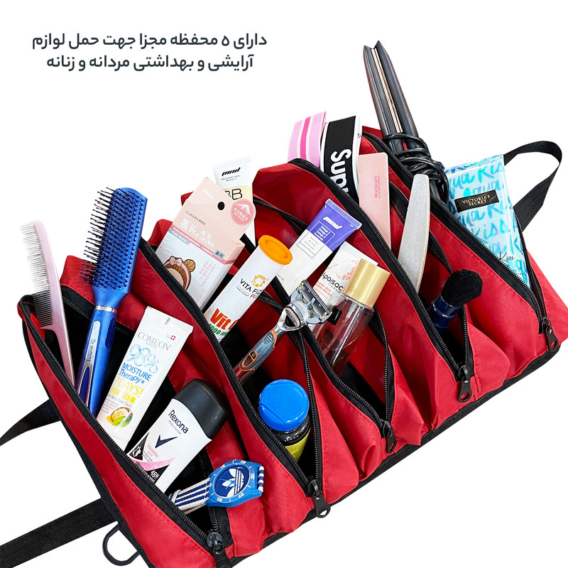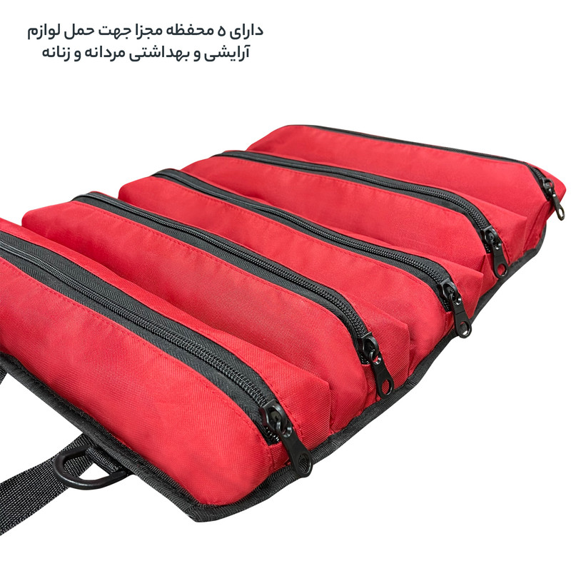 دارای 5 محفظه زیپی مجزا جهت استفاده به عنوان کیف لوازم شخصی مردانه و زنانه و قابل استفاده به عنوان کیف ابزار