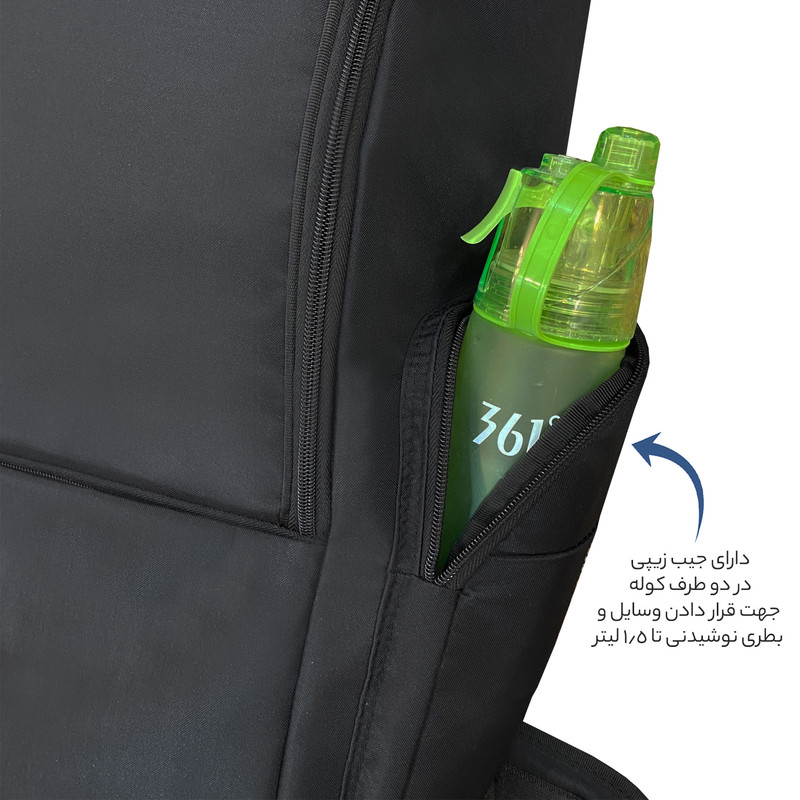 دارای یک جیب زیپی بسیار یزرگ قابل باز شدن به صورت چمدانی جهت قرار دادن وسایل سفر و دسترسی آسان به وسایل دارای دو جیب زیپی بزرگ در دو طرف کوله جهت قرار دادن وسایل و یا بطری نوشیدنی تا 1.5 لیتر دارای دو جیب زیپی در قسمت رویی کوله