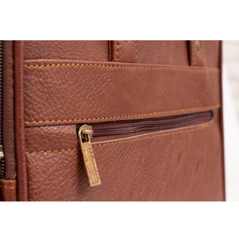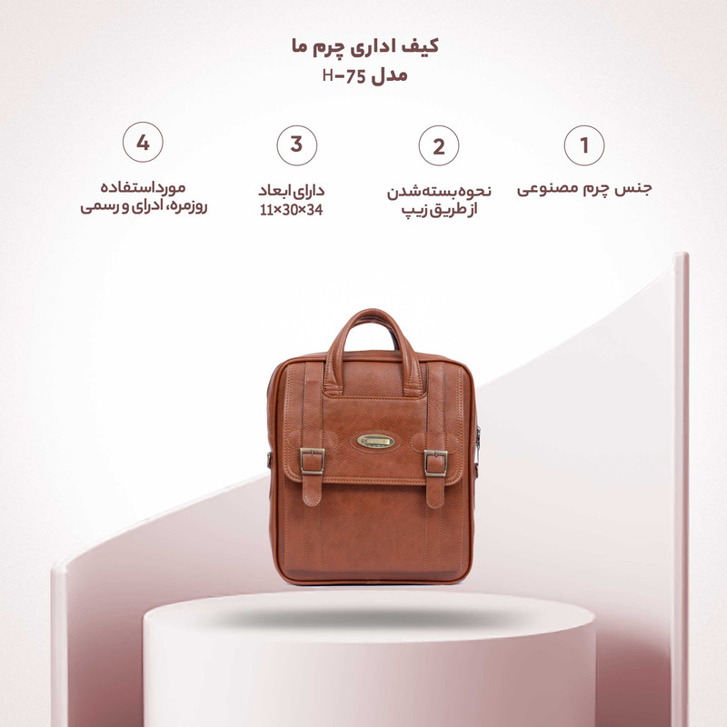 یک کیف اداری که علاوه بر زیبایی ظاهری، فضای داخلی مناسبی برای قرار دادن انواع لوازم شخصی دارد. رویه این کیف در رنگ های مشکی، قهوهای روشن و تیره نسبتا براق در نظر گرفته شده است. محفظه اصلی به وسیله زیپ بسته میشود و فضای کافی برای نگهداری انواع وسایل مورد نیاز برای یک کیف اداری را دارد. علاوه بر دو دسته مقاوم که در بالای کیف وجود دارد، یک بند دوشی قابل جدا شدن امکان حمل آن به شکل رودوشی را هم امکان پذیر کرده است. یک محفظه دکمه دار در جلوی کیف وجود دارد که برای جا دادن وسایل کوچک و دم دستی مثل دفترچه و یا گوشی موبایل بسیار مناسب است. به علاوه در قسمت پشت کیف یک جیب زیپدار مخصوص وجود دارد که باعث سروسامان دادن هر چه بیشتر فضای کیف میشود. کیف اداری مدل H-75 از چرم مصنوعی و مرغوب « چرم ما » تهیه شده و برای تکمیل یک ظاهر کلاسیک و رسمی انتخابی ایدئال خواهد بود.