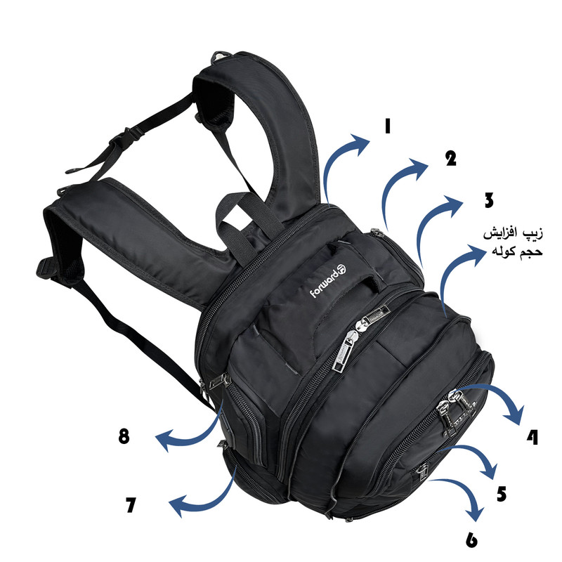 کوله پشتی 55 لیتری فوروارد کد 7707 با طراحی کاربردی و امکانات متنوع، گزینهای مناسب برای استفاده روزمره، کاری یا دانشجویی است. در بخش داخلی، یک محفظهی اصلی مجزا همراه با محافظ لپتاپ ضربهگیر در چهار جهت (راست، چپ، جلو و پشت) تعبیه شده که از دستگاه شما در برابر ضربه محافظت میکند. همچنین یک جیب مخصوص برای قرار دادن تبلت در قسمت کف کوله در نظر گرفته شده است.