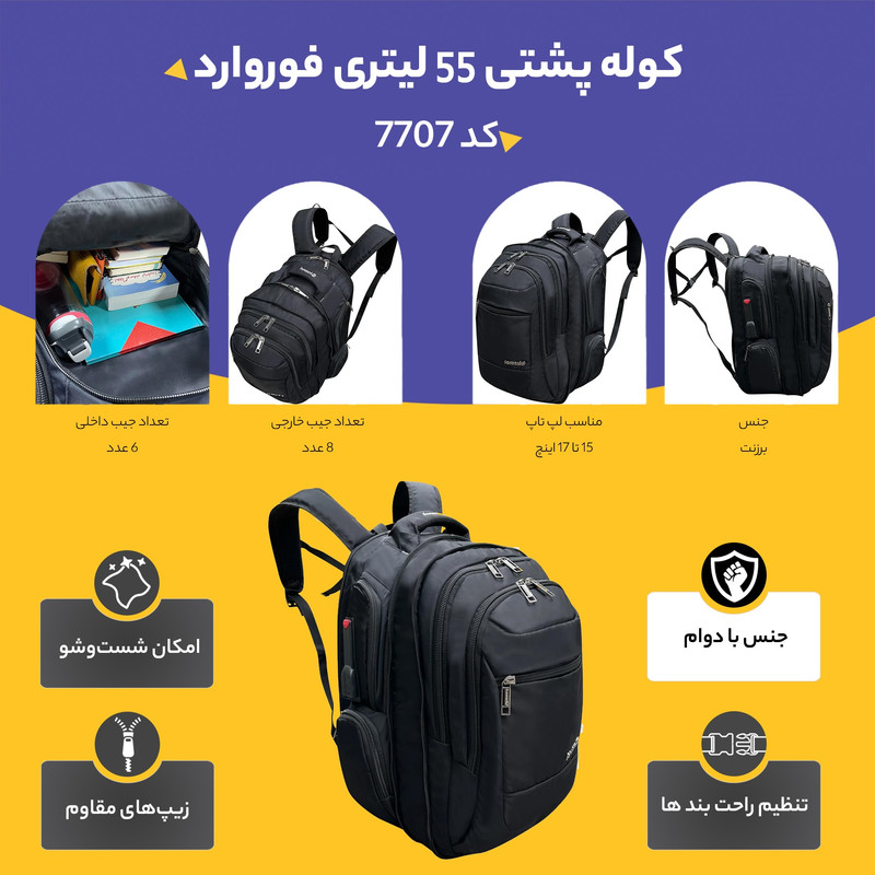کوله پشتی 55 لیتری فوروارد کد 7707 با طراحی کاربردی و امکانات متنوع، گزینهای مناسب برای استفاده روزمره، کاری یا دانشجویی است. در بخش داخلی، یک محفظهی اصلی مجزا همراه با محافظ لپتاپ ضربهگیر در چهار جهت (راست، چپ، جلو و پشت) تعبیه شده که از دستگاه شما در برابر ضربه محافظت میکند. همچنین یک جیب مخصوص برای قرار دادن تبلت در قسمت کف کوله در نظر گرفته شده است.