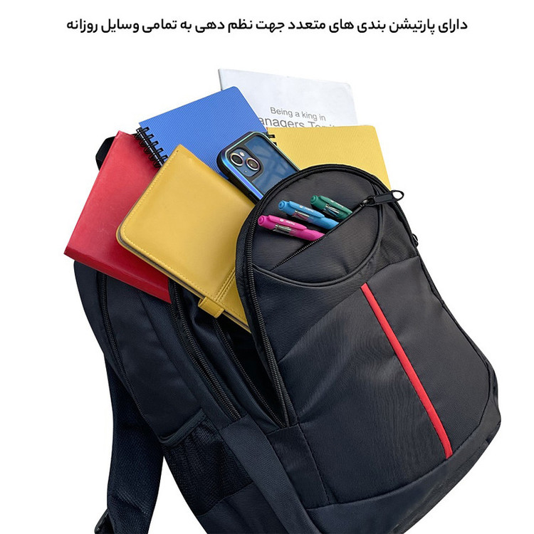 دارای یک محفظه اصلی همراه با پارتیشن بندی داخلی جهت حمل وسایل اصلی روزانه و لپتاپ دارای دو جیب میانی جهت قرار دادن وسایل روزانه دارای دو جیب در سمت راست و چپ کوله جهت قرار دادن وسایل و یا بطری نوشیذنی