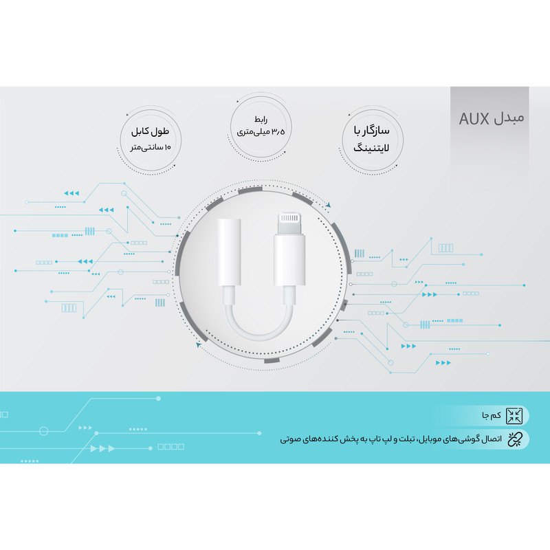 جنس روکش کابل: TPE سازگار با گوشی های موبایل، آیپد و دیگر دستگاه های مجهز به درگاه لایتنینگ مناسب برای اتصال دستگاه های مجهز به کانکتور 3.5 میلی متری صدا به دستگاه های دارای درگاه لایتنینگ
